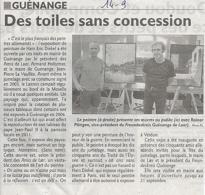 Il est le plus franÇais des peintres allemands : cette formule convient on ne peut mieux à Hain Eric Diekel. Et cela fait longtemps qu'il est connu à Guénange. Il y avait même déjà campé avant le jumelage sur les bords de la Moselle. Plusieurs de ses tableaux d'ailleurs représentent ces lieux, dont la fameuse " cathédrale " qui depuis a perdu des plumes, je veux dire ses tours.